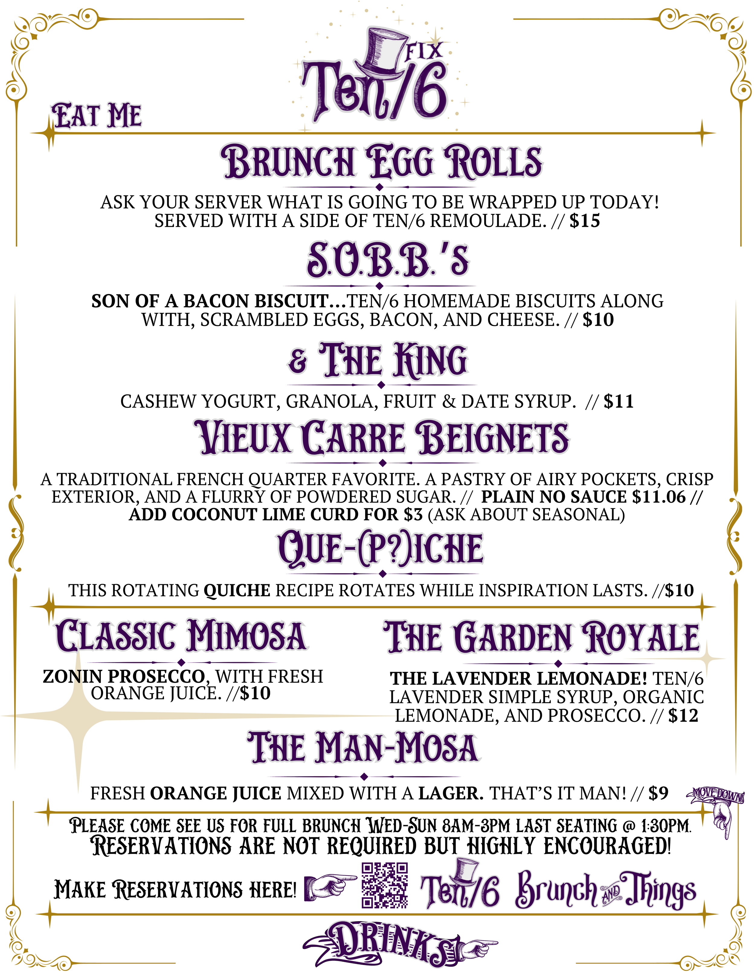 At Ten/6, we take food allergies and dietary restrictions seriously and strive to accommodate our guests’ needs to the best of our ability. However, please be advised that our kitchen handles common allergens including, but not limited to, dairy, eggs, wheat, gluten, soy, peanuts, and tree nuts.